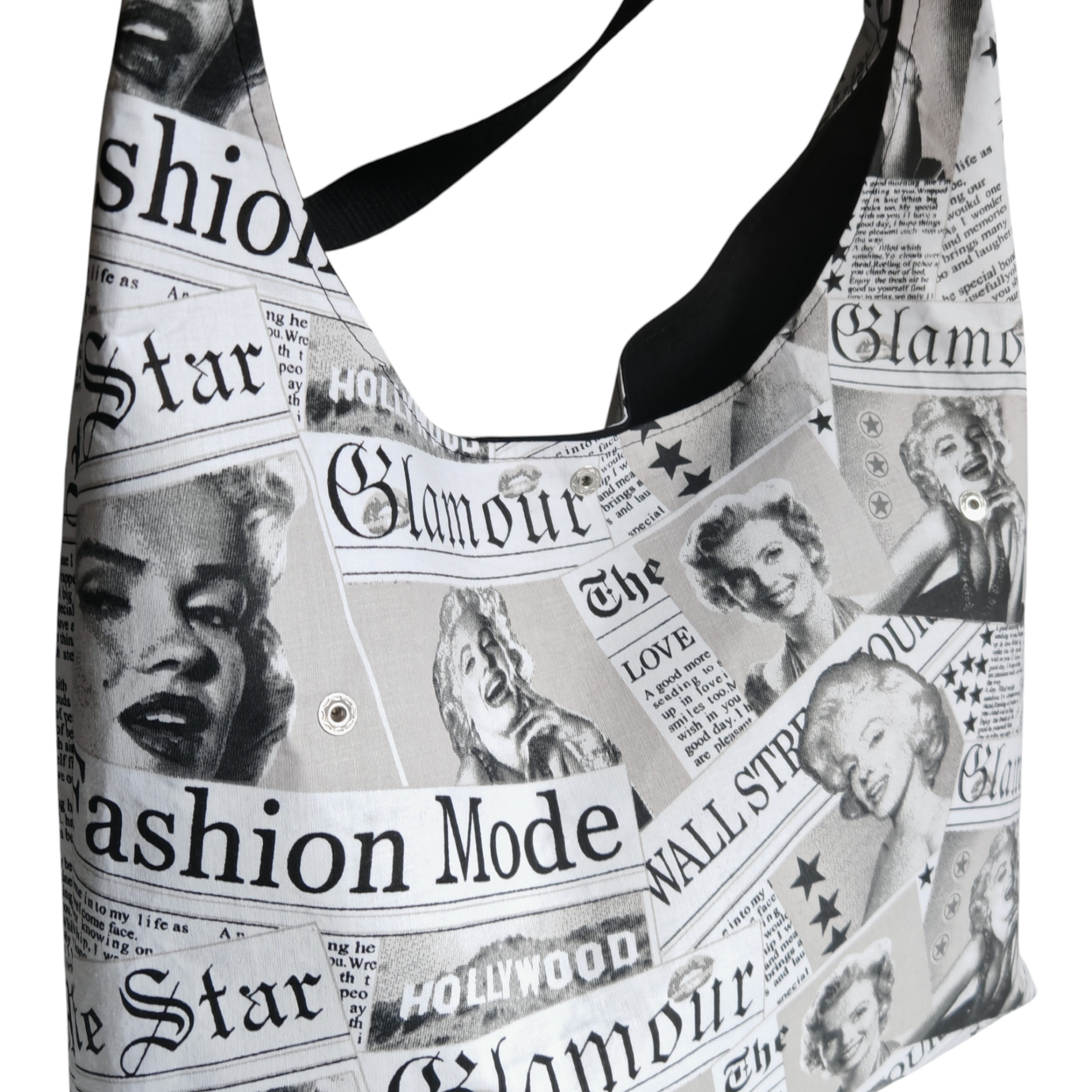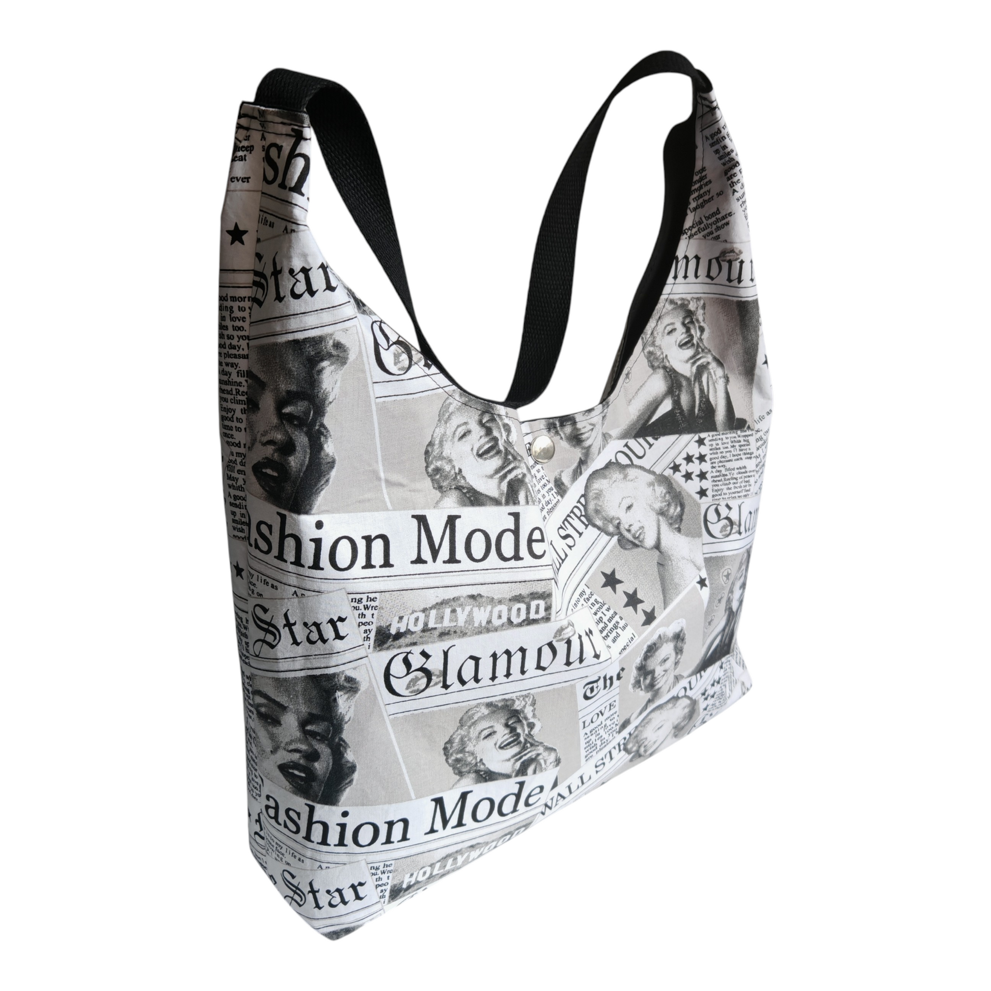 Sac hobo porté épaule motif journal de mode Marylin Monroe noir et blanc.